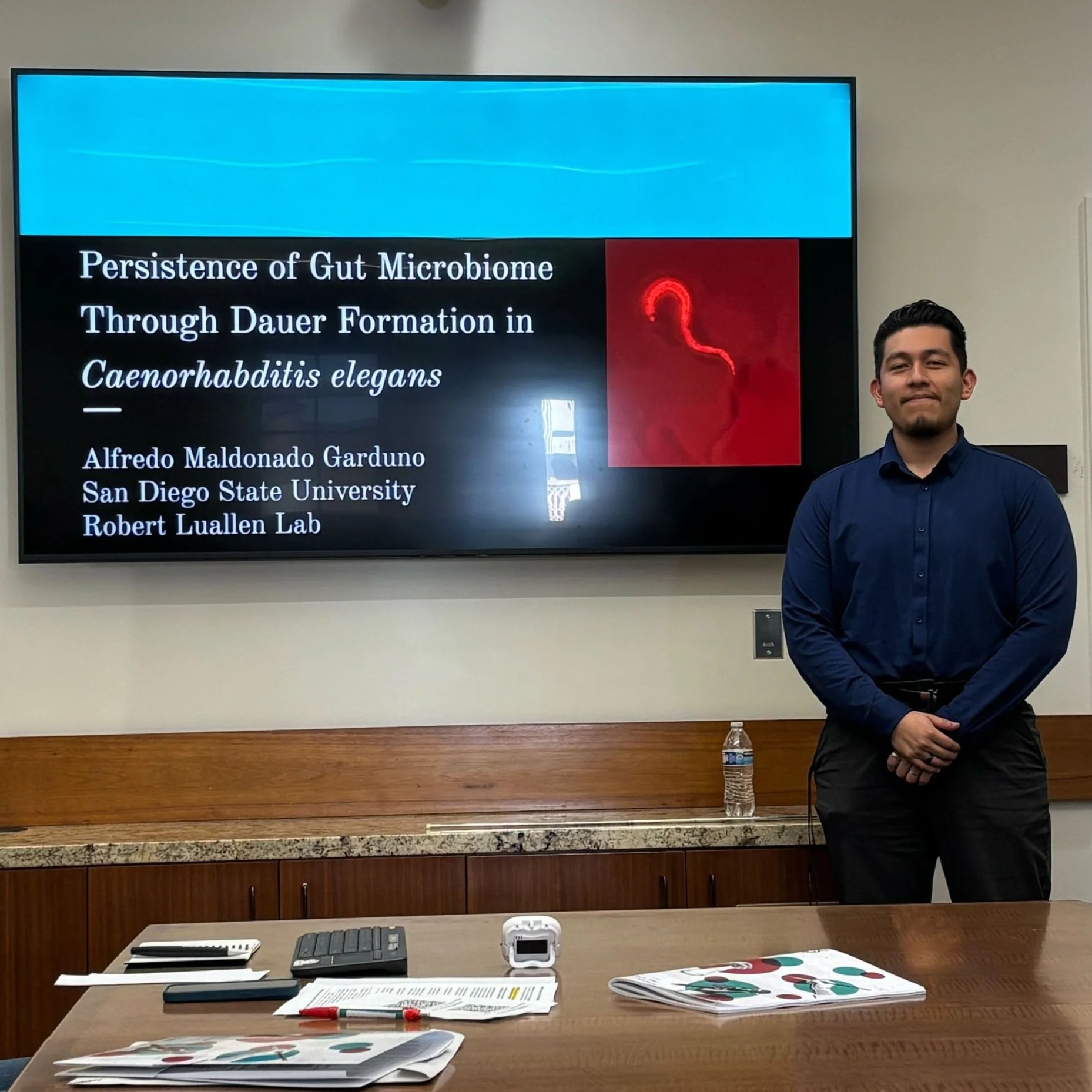 Alfredo gives a talk on his discovery that C. elegans dauers can maintain microbiome bacteria over 25 days.